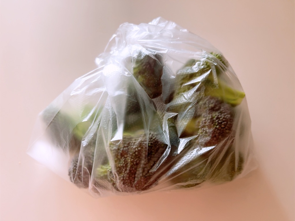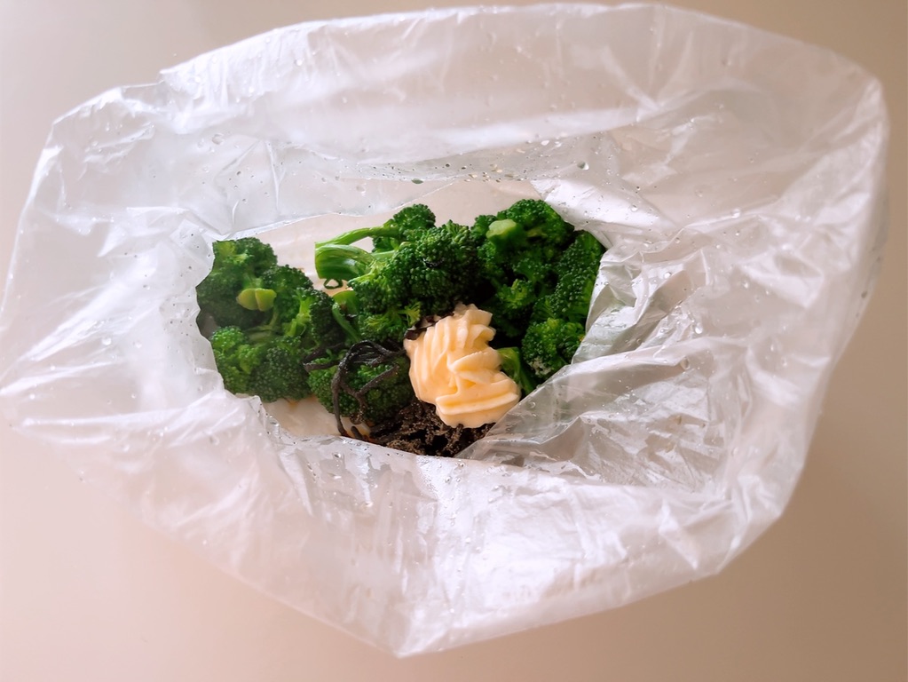 3.600Wで1分30秒加熱し■を全て入れ、袋を閉じてふり混ぜる。